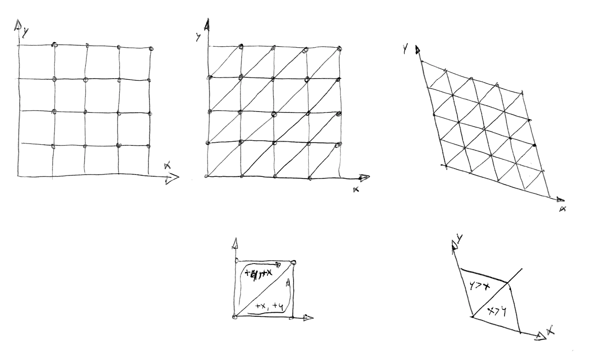 In the following code you can uncomment line 44 to see how the grid is skewed, and then uncomment line 47 to see how a simplex grid can be constructed. Note how on line 22 we are subdividing the skewed square into two equilateral triangles just by detecting if x > y ("lower" triangle) or y > x ("upper" triangle).